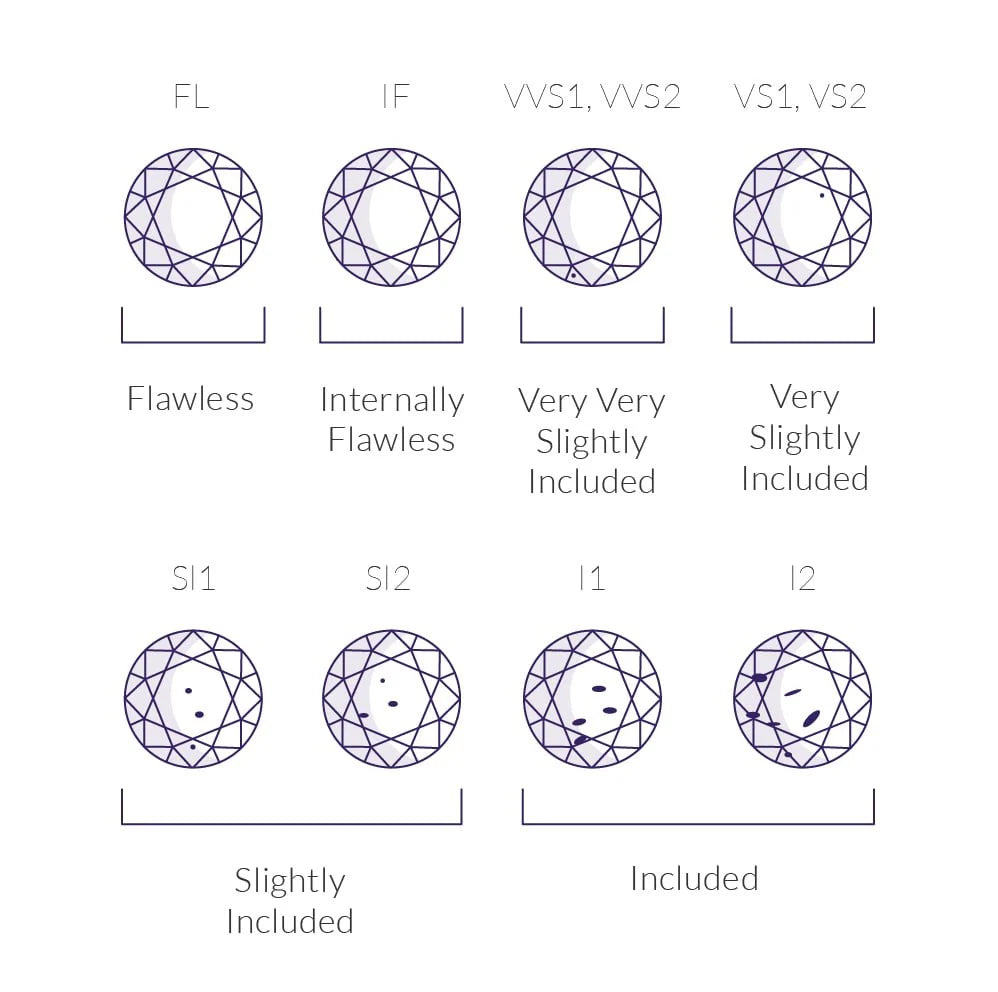 Clarity refers to the relative presence of inclusions (imperfections) within a diamond or the presence of surface abrasions, chips, or any other type of surface imperfections. Over 99.99% of diamonds have some sort of clarity characteristics which are used to assign these stones their appropriate clarity grades. Unless a diamond is deemed to be Flawless, it will have some form of clarity characteristic(s). From the least amount of clarity characteristics to the most, this is the industry accepted clarity scale.