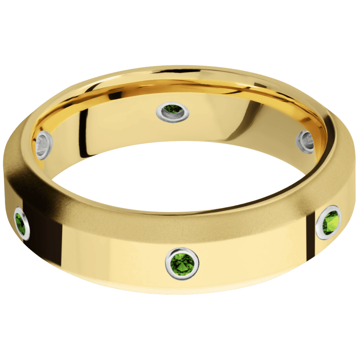 6 mm wide/High Bevel/14K Yellow Gold band with a 6X Even arrangement of .03 carat Round Lab Green Diamond stones in a Bezel setting.