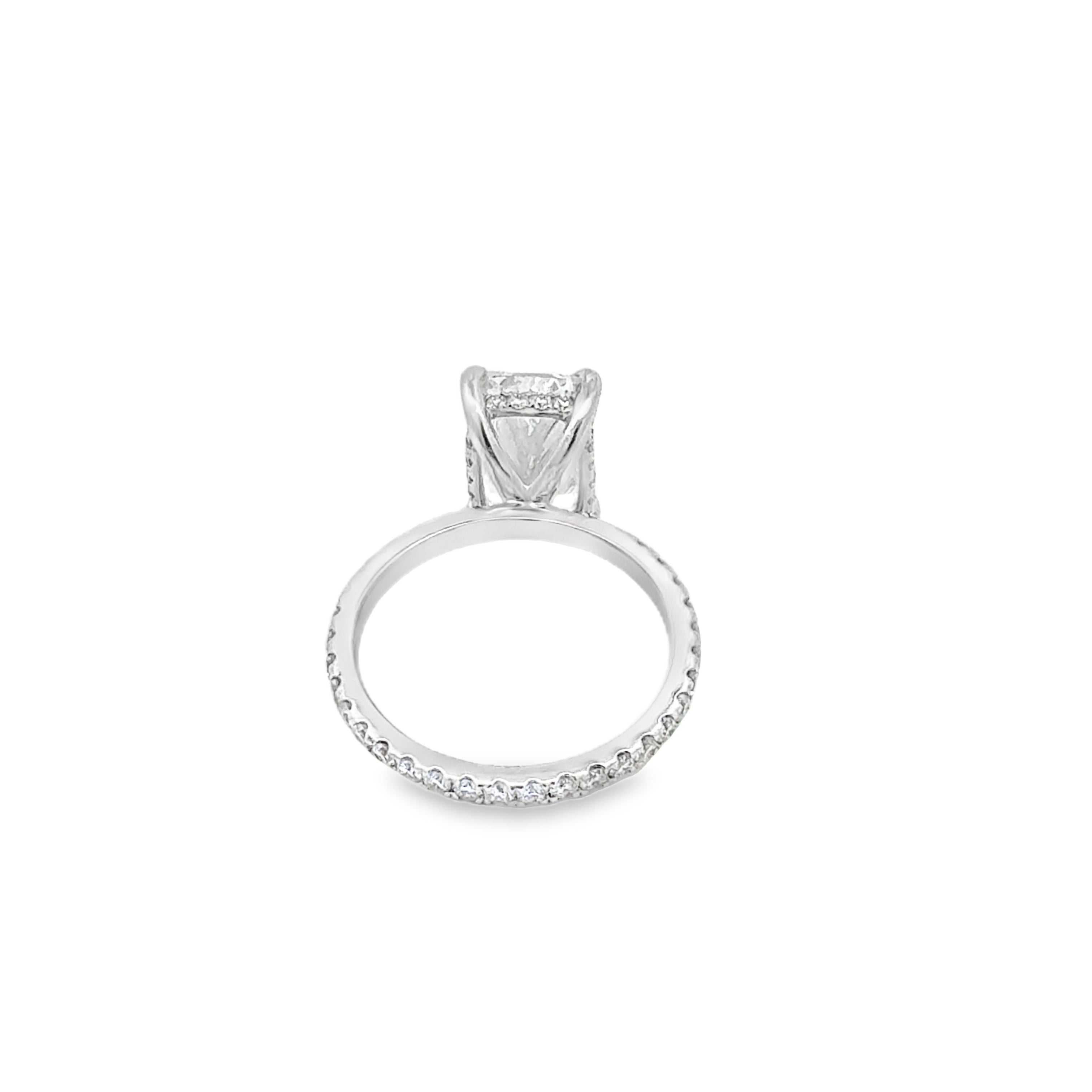 This stunning ring features a 3.28ct D VVS2 lab radiant-cut diamond set in 14k white gold with .79ctw of lab accent diamonds. This ring is currently a size 6.