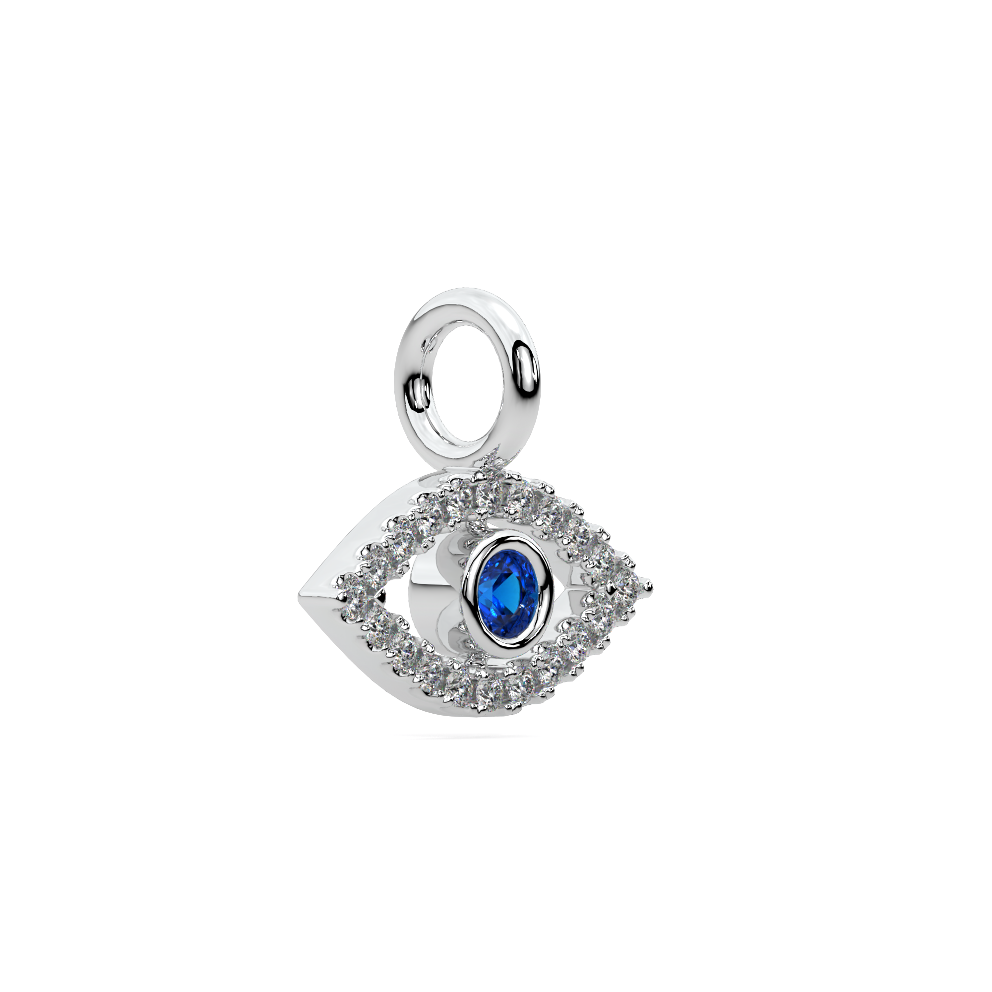 This stunning charm is available in both 14k yellow and white gold. It features 0.07ctw of lab diamonds with a 0.04ct 2.20mm lab blue sapphire center stone. The Eye Dimensions are 6.50x12.00mm with a 5.00mm round loop bail. All charms are sold independently, please inquire about a chain if interested!