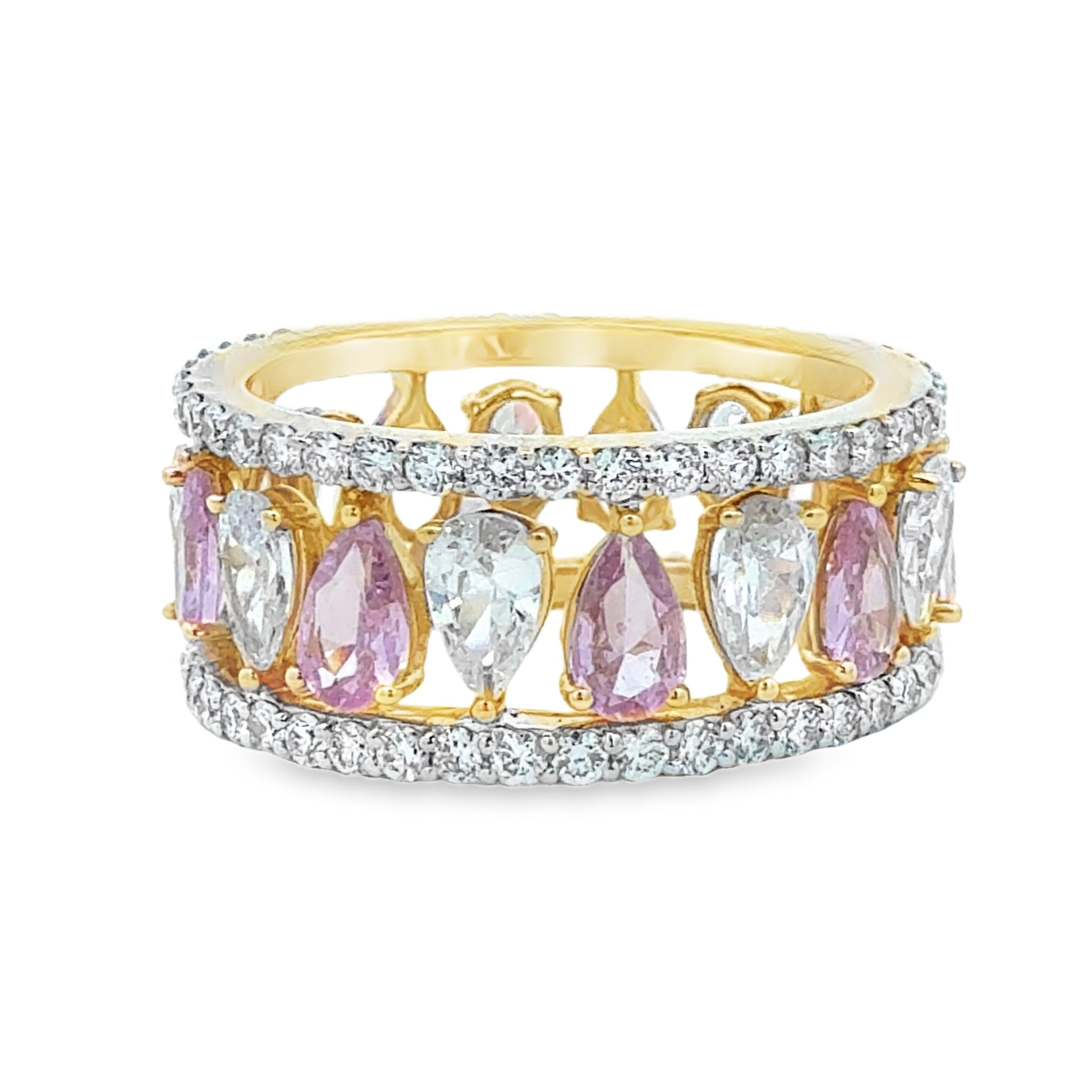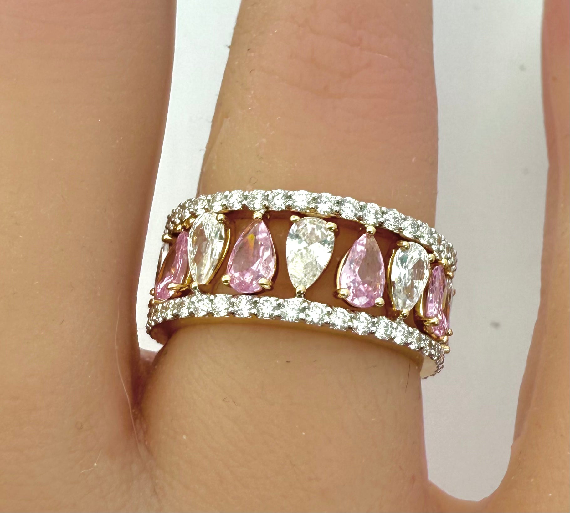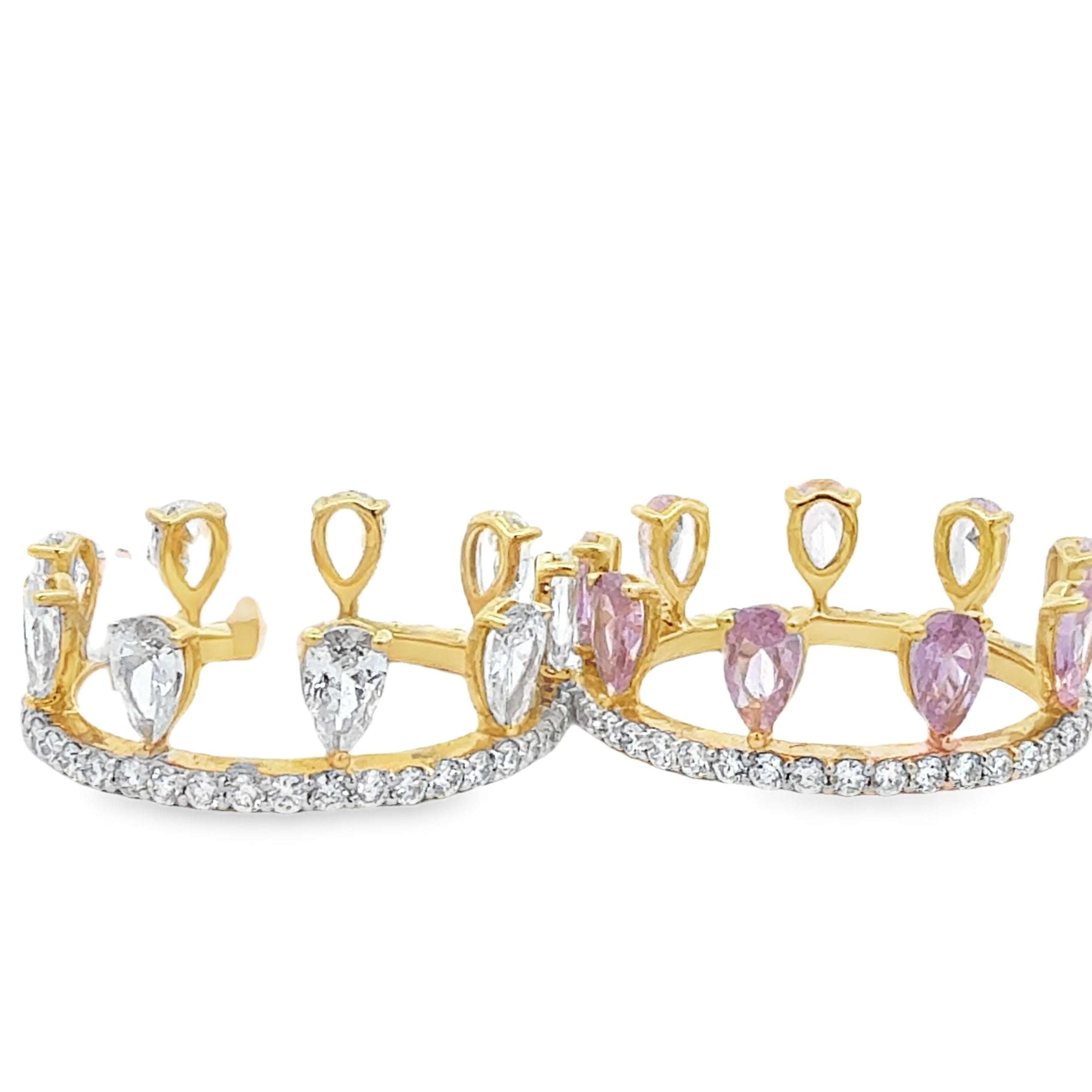 Upgrade your jewelry collection with our Interlocking Pear Rings. Featuring 1.02ctw lab diamonds and a 14k yellow gold interlocking ring design, these rings combine elegance and durability. The white pears are Lab Diamonds and the pink pears lab colored gemstone.