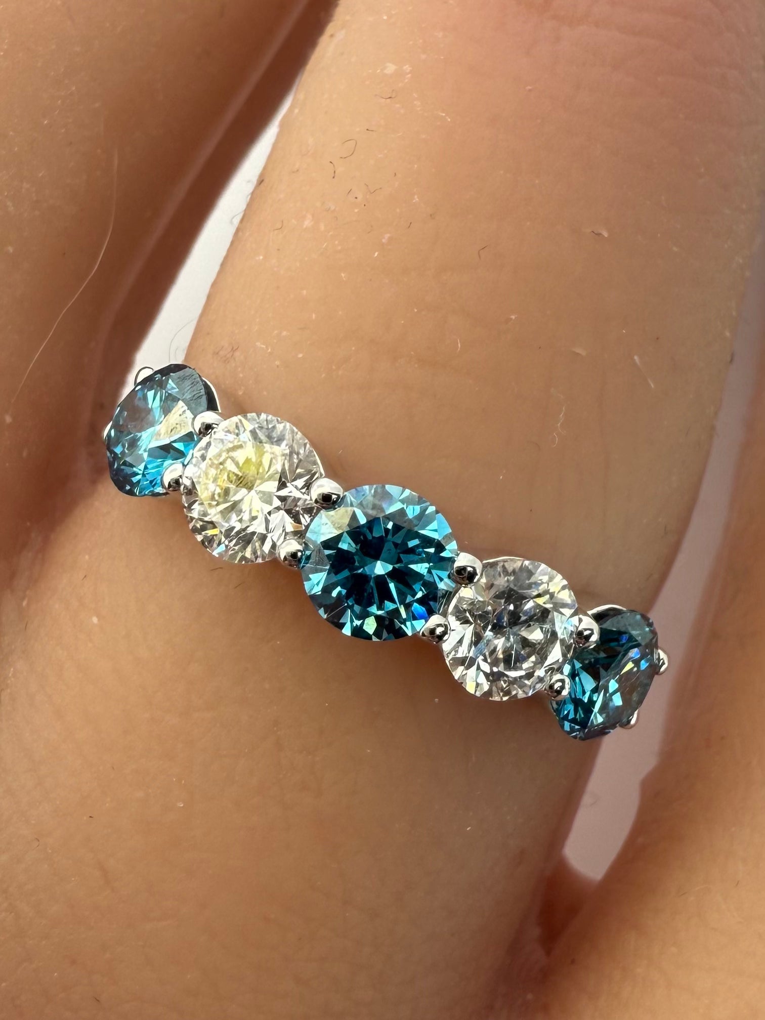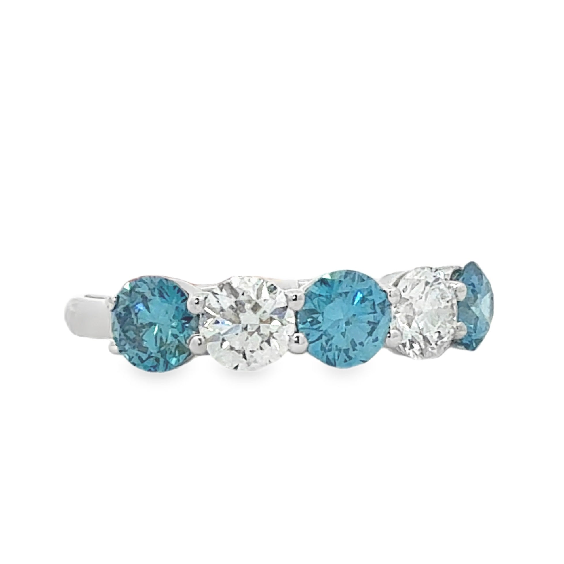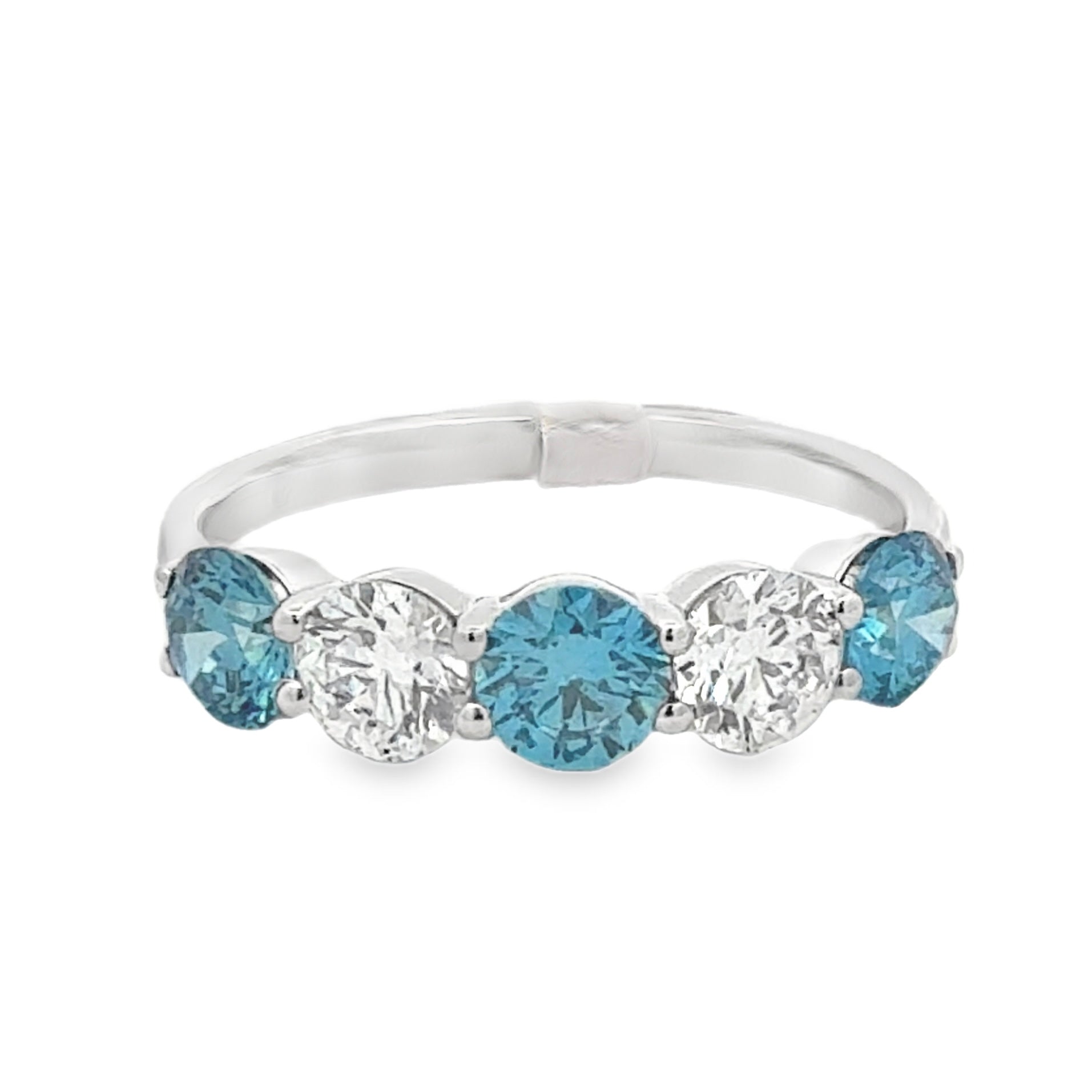 Featuring a stunning 1.55ctw of lab diamonds, the Lab Five Stone Band is crafted in timeless 14k white gold. The alternating blue and white stones create a striking and unique design, making it a perfect addition to any outfit. Expertly crafted using only the highest quality materials, this band exudes luxury and elegance. This is a Custom peice and has a lead time of 2-4 weeks once ordered for production.