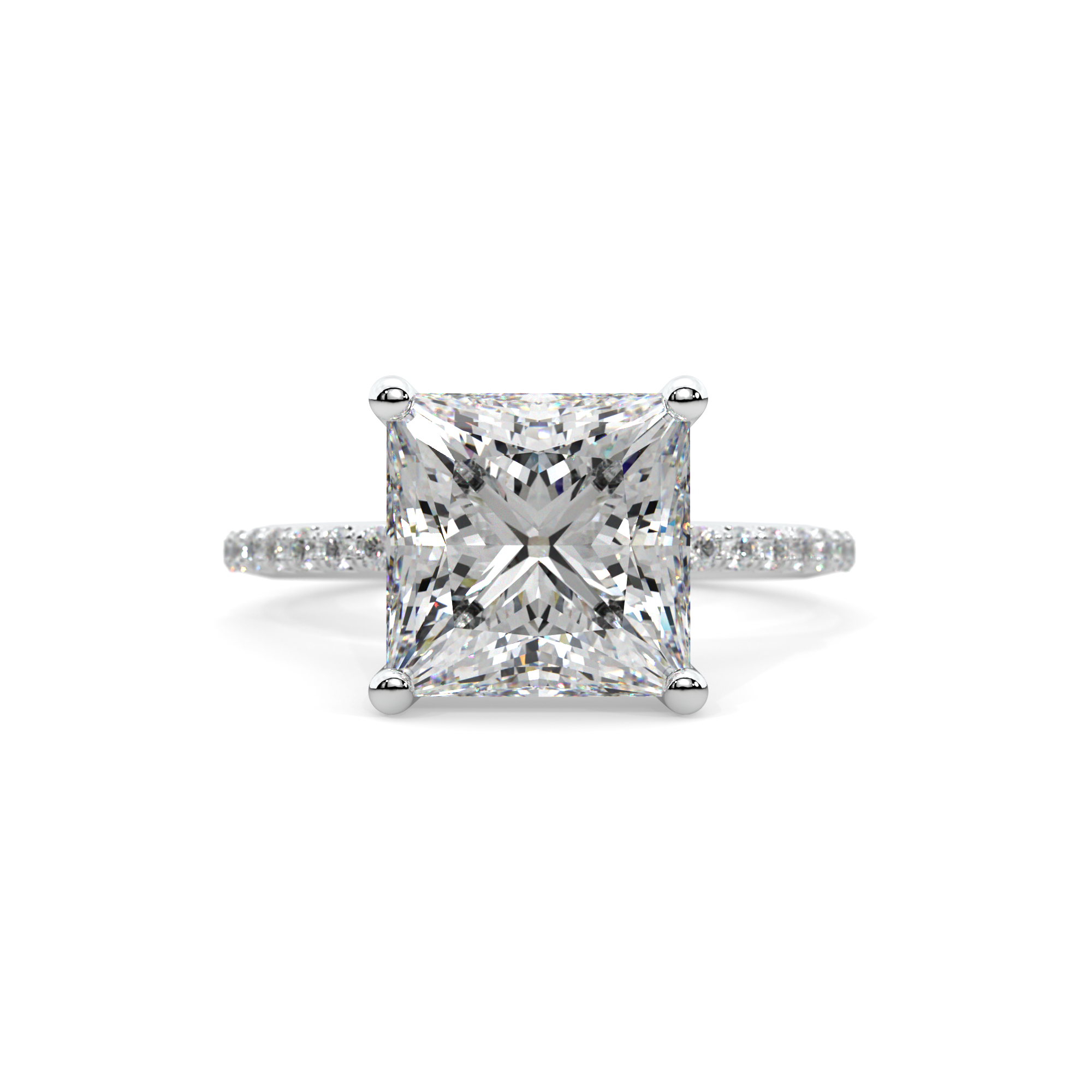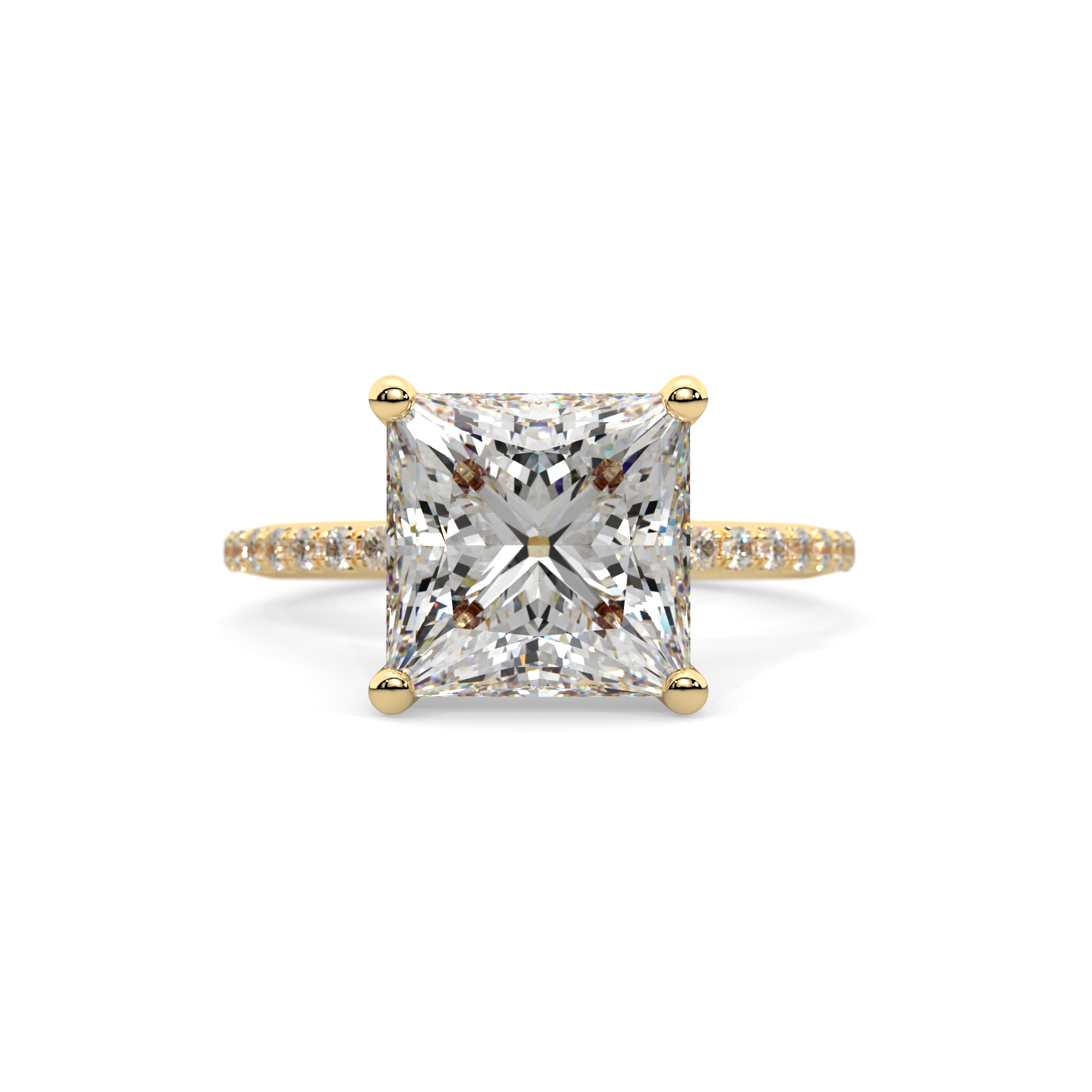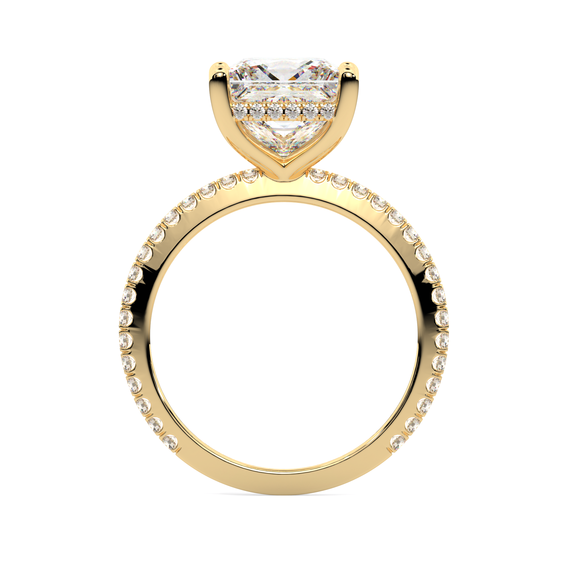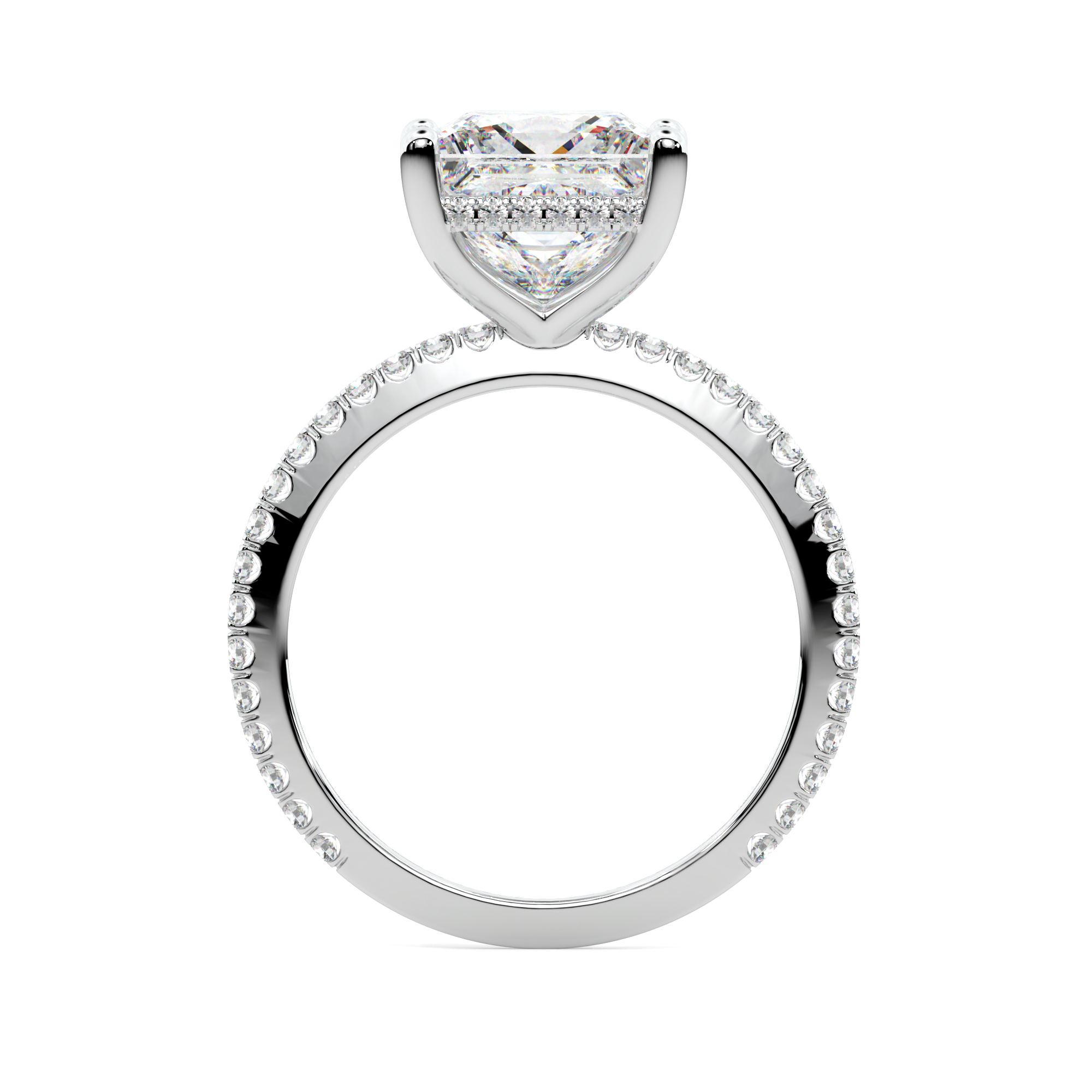 This elegant solitaire style ring showcases a stunning Princess cut diamond with a surprise hidden halo of diamonds nestled under the center stone and French set diamonds going 3/4 down the band. It has a total carat weight of 0.38-0.40ctw. Expertly crafted in a classic design, this ring exudes sophistication and elegance. Price is for the mounting alone, please inquire about stone options.
