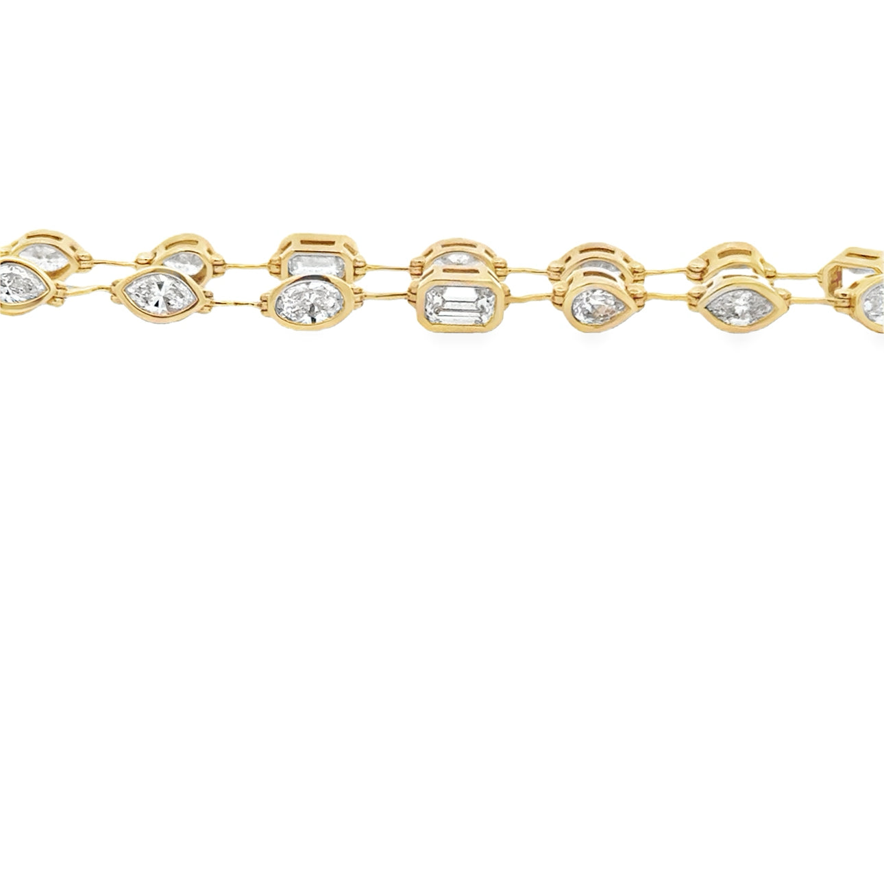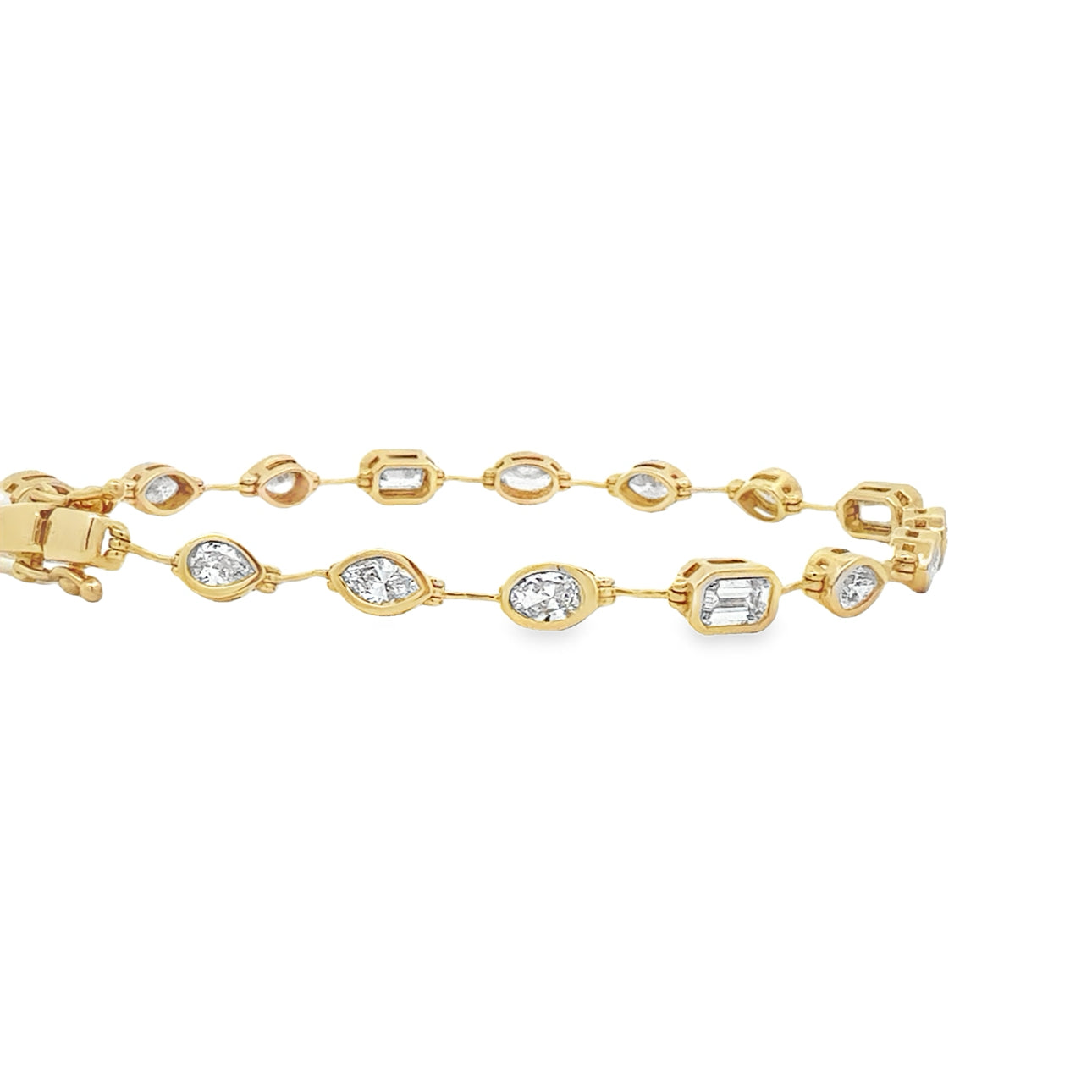 This jaw dropping bracelet features 3.52ctw of bezel set, Multi-shaped Lab Diamonds in 14k yellow gold. This bracelet is made to order and takes roughly 3-4 weeks once ordered.
