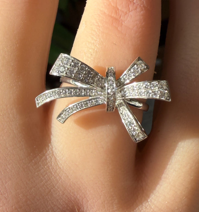Elevate your style with our Pavé Bow Ring. This stunning ring features 0.42ctw of lab diamonds set in 14k white gold, creating a unique and elegant bow design. Make a statement with this timeless piece that combines luxury and sophistication. This is a custom piece and has a lead time of 2-4 weeks once ordered for production.
