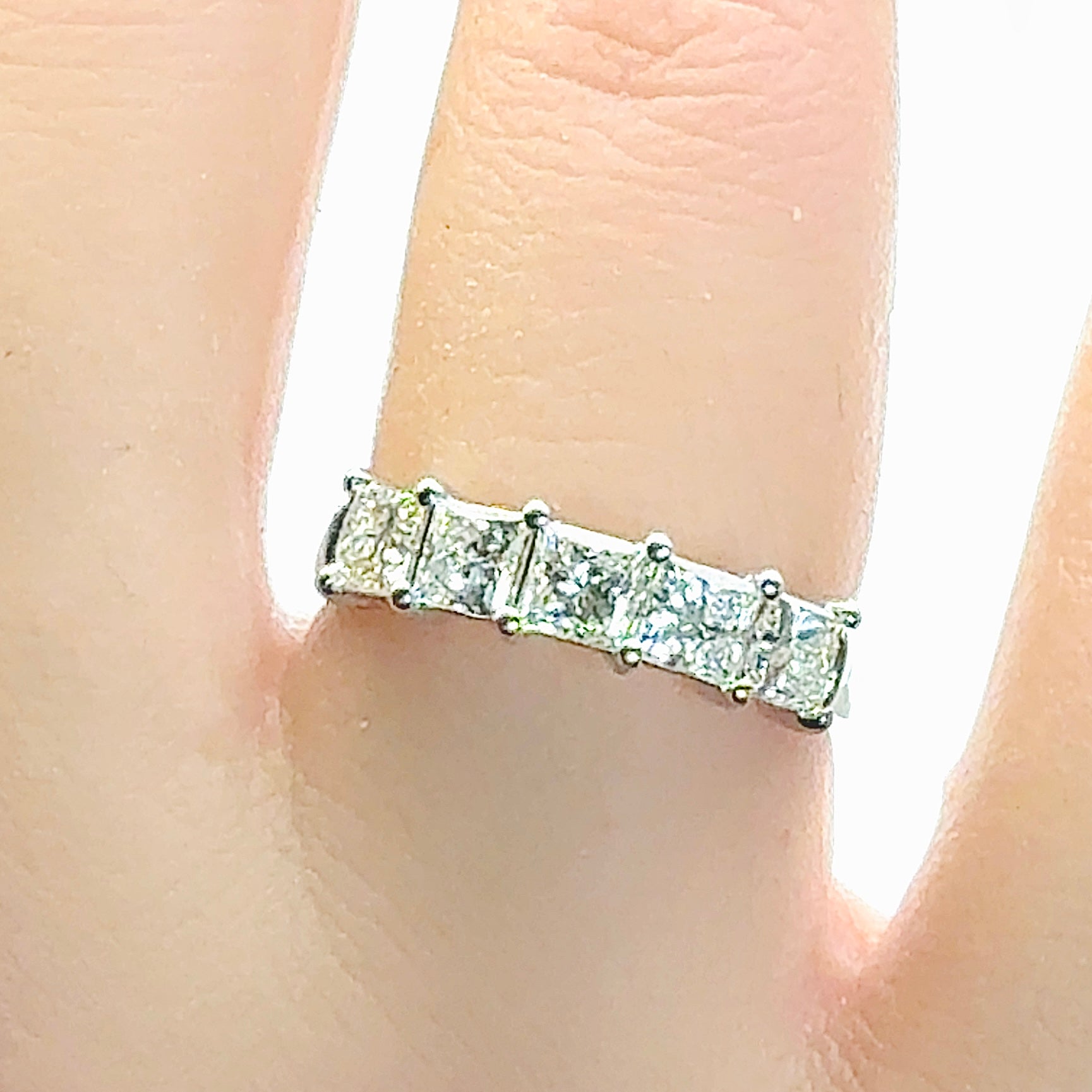 Expertly crafted from 14k white gold, this Princess cut band features brilliant 1.43ctw lab diamonds. Five stunning stones create a timeless piece that exudes elegance and sophistication. Perfect for any occasion, this band will make you feel like royalty.